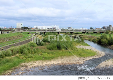 終着札幌駅が近づき速度を落としながら豊平川を渡る快速「エアポート」
