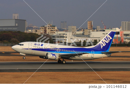 大阪国際空港に着陸する、全日空のボーイング737-500「スーパードルフィン」機