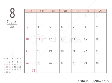 美しい風景画の1ページ2ヶ月のカレンダー、7月・8月
