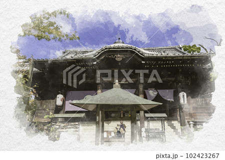 水彩画風 四国八十八箇所86番 志度寺 閻魔堂 香川県さぬき市