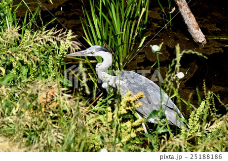 東京都三鷹市の野鳥 仙川河岸の草地に立つアオサギ