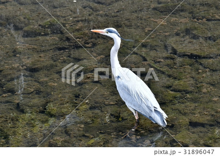 東京都三鷹市の野鳥 仙川浅瀬に立つ少し頭の濡れたアオサギ