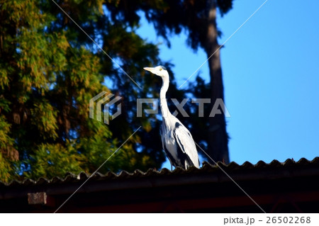東京都三鷹市の野鳥。三鷹市仙川岸辺の建物、屋根上のアオサギ。