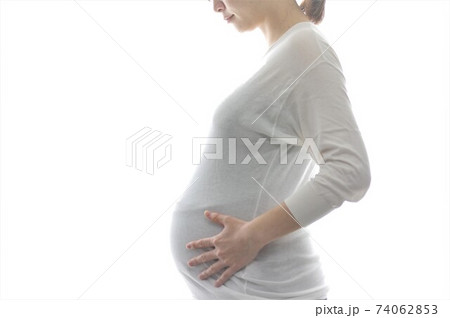 リボンを結んだおしゃれな夫婦マタニティフォトイメージ 白背景1(本物の臨月妊婦さんを撮影)