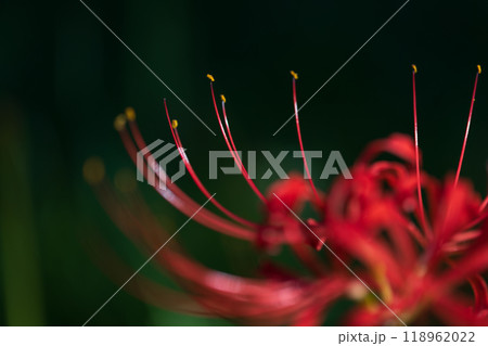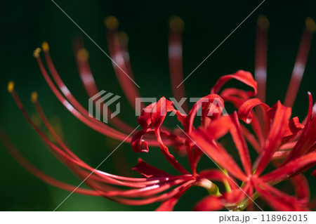 暗い背景をバックに斜光映えする真っ赤なヒガンバナ2