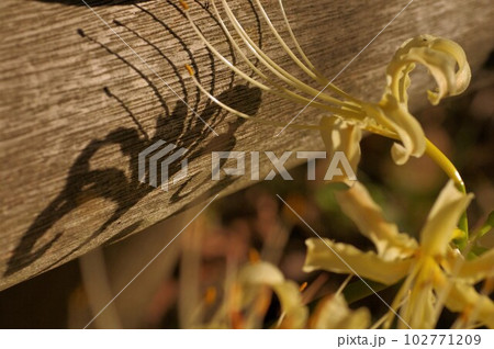 お彼岸のころ朝光に映し出されたヒガンバナの影