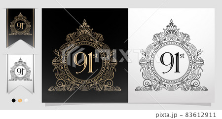 Happy Anniversary 91st Frame and border with crown. number element with color gold isolated background, for letterpress, embroidery, invitation wedding anniversary and sign label.