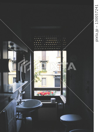 ローマ市内の古い建物 青空とアパートの窓とバルコニー