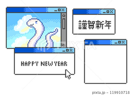 懐かしいブラウザフレームと、青空をバックに微笑む爽やかな白蛇のドット絵年賀状素材