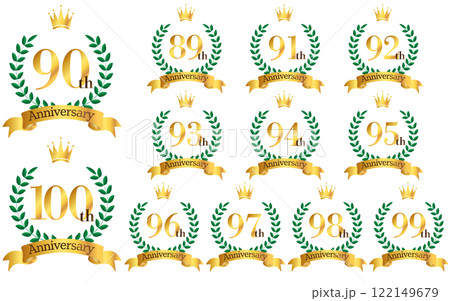 89~100周年イラスト 月桂樹の葉と王冠とリボンのマーク アイコンセット