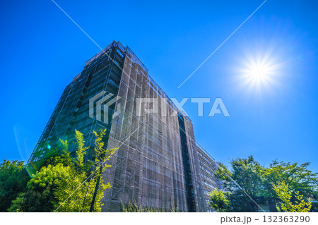日本の横浜都市景観 夏空が広がる…マンションの補修や点検等、足場や防護ネット、衛星アンテナが…