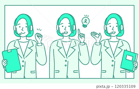 ヘッドセットを付けてリモート対応・スーツの女性イラスト3点セット・シンプルでポップなベクターイラスト