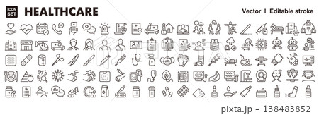 医療とヘルスケアのアイコンセット(細線・ベクター素材)診療、薬、病院素材