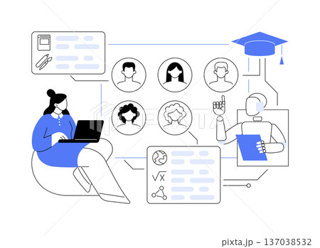Vector illustration depicting online learning activities. Students interact with educational platforms and AI tutors using digital devices, highlighting technological education methods.