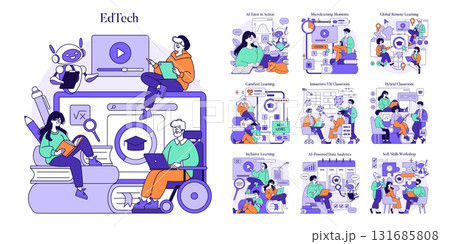 Detailed vector illustrations showcasing diverse educational technologies like AI tutors, gamified learning, and VR classrooms with a focus on inclusive and remote education strategies.