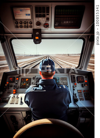 Train driver in the cab of a moving train