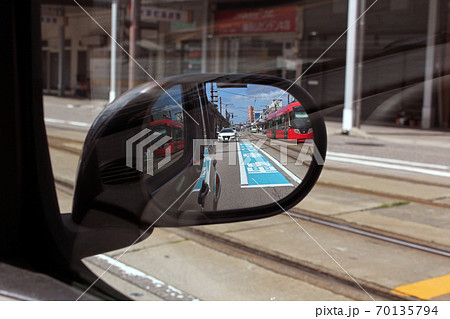 【富山県】車のサイドミラーに映る路面電車