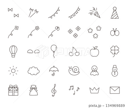 かわいいアイコンセットのベクターイラスト。飾り、リボン、天気、花、プレゼント