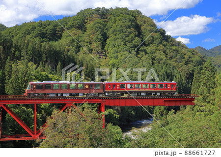 大又川橋梁を渡る「秋田縄文号」と「笑 EMI」