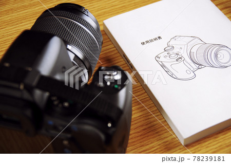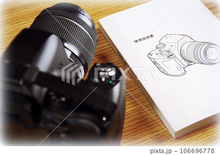 木目の机に置いたデジタル一眼レフカメラと付属の説明書