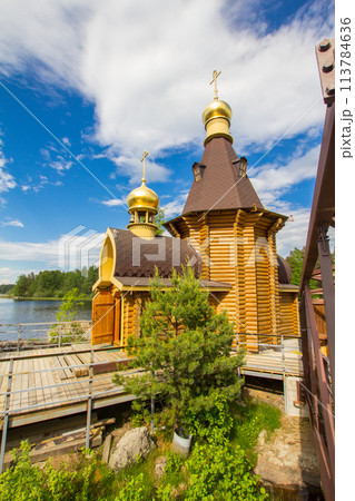 beautiful view to wooden Church of St. Apostle Andrew First-Called on Vuoksa River with bridge. Temple on small island near village Vasilevo, Melnikovo, Priozersky District Leningrad region. Russia