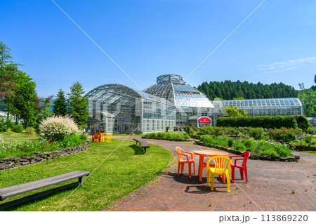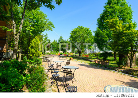 美しい自然光芒を浴びるガーデンテーブルと新緑風景(観光スポット バラ園内風景)(はな阿蘇美))