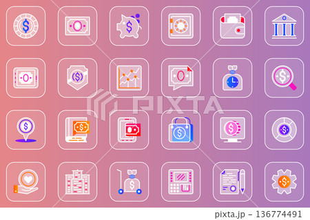 Financial items web glassmorphic icons set. Pack outline pictograms of money and coin, piggy bank, wallet, savings, profit growth, shopping, commerce, charity and other. Vector line glass symbols