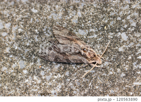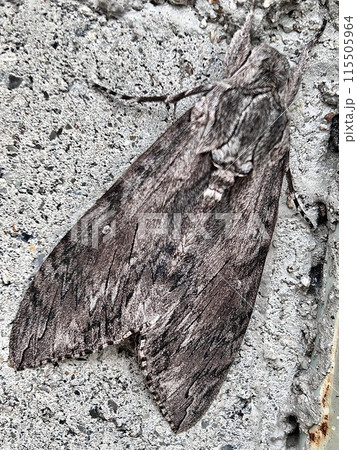 コンクリートの道路と同化するエビガラスズメ蛾の成虫(自然光マクロ接写)
