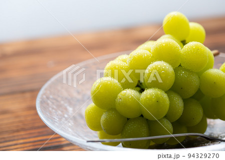 秋の味覚 シャインマスカットとピオーネ ( 木目背景 )