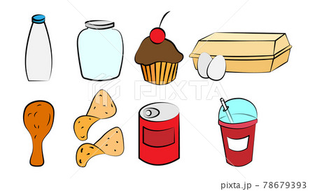 A set of eight icons of items of delicious food and snacks for a cafe bar restaurant on a white background: milk, can, cupcake, eggs, chicken, chips, soda, lemonade