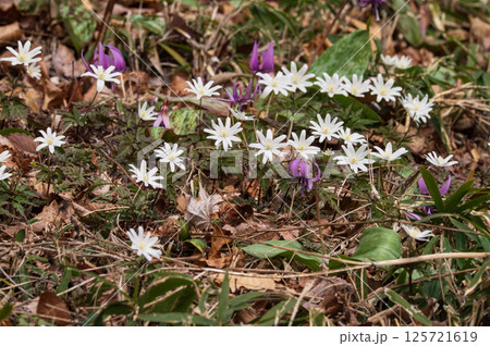 初春の白河の関のキクザキイチゲ、福島県白河市旗宿関ノ森