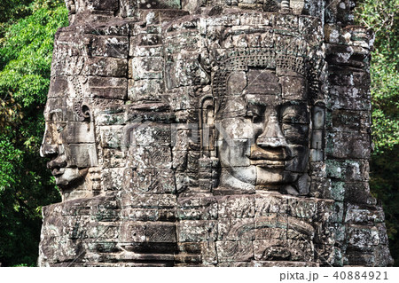 The stone faces of the khmer king on the wall of Bayon Temple, Angkor Thom, Siem Reap, Cambodia.