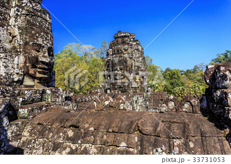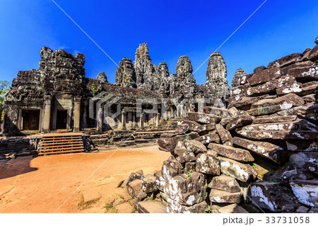 Ancient Bayon temple yard and tower with carved stone faces, Angkor Thom, Siem Reap, Cambodia