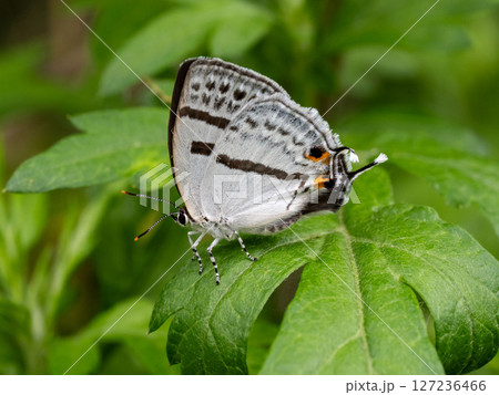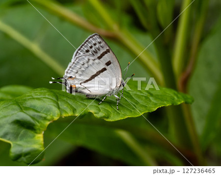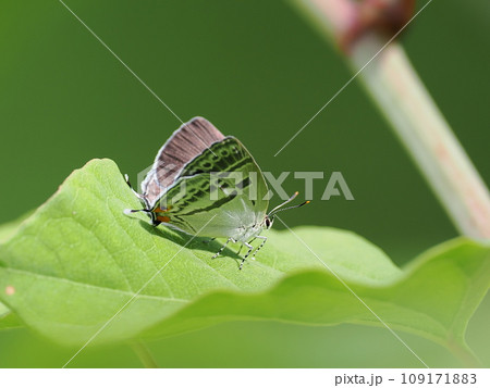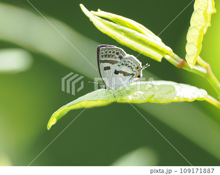 葉の上にいるミズイロオナガシジミ