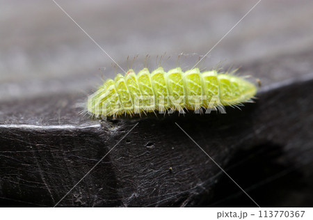ミズイロオナガシジミ蝶の幼虫(自然光+ストロボ、マクロ接写撮影)