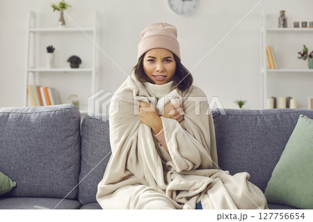 Woman wrapped in a plaid suffering from the cold in a bright living room in the apartment.