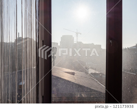 Cityscape with mountain view in the morning time concept photo. Modern art - stainless steel sculptures