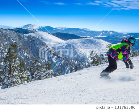 雪煙を上げてターンするスノーボーダーと冬山のパノラマ風景 (群馬県、渋峠)