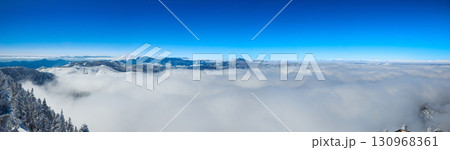 雲海に浮かぶ浅間山とアルプスの山々が広がる雪山の絶景 (長野県、山ノ内町、横手山)