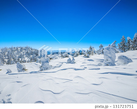遠くに浅間山を望む風雪紋と樹氷の森が美しい雪山 (長野県、志賀高原、横手山)