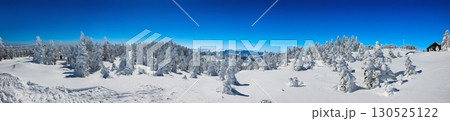横手山頂から望む樹氷、雪に埋もれた鳥居、浅間山、山頂駅舎のパノラマ (長野県、山ノ内町、横手山)