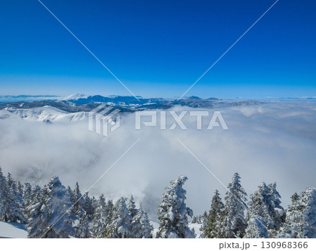 ツリーホールが見られる深い雪と樹氷が広がる雪山の絶景 (長野県、山ノ内町、横手山)