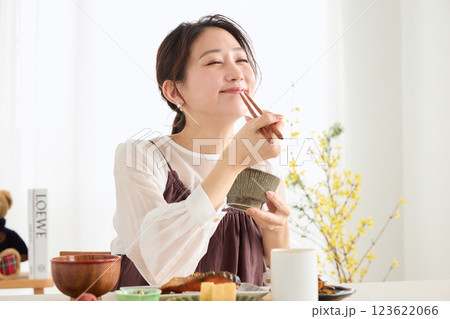 ダイニングで朝ごはんを食べる女性