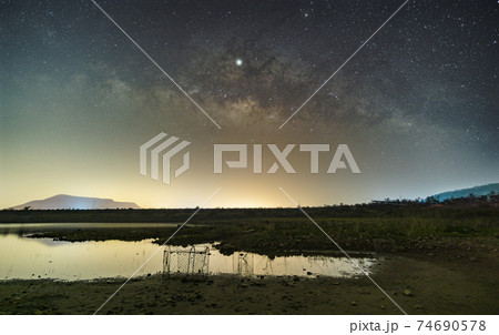 The stars in the sky reflect the light at night. The Milky Way above the mountains and the pond Mae Prachan Dam and Reservoir, Phetchaburi, Thailand