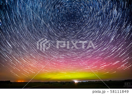 Star trails around the Polar Star or Polaris and green glowing display of Northern Lights or Aurora