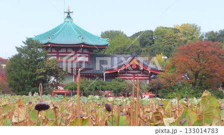 赤い和傘とライトアップされた木々が池に反射する日本庭園の夜景 (東京都、文京区、六義園)