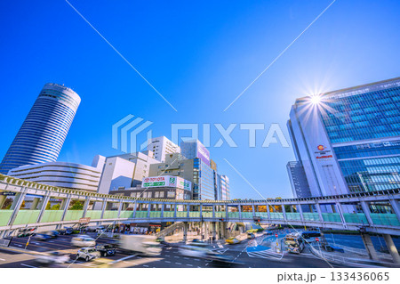 日本の横浜都市景観 インバウンド…(賑わう)新横浜駅や飛行機雲、太陽などを望む。新時代へ