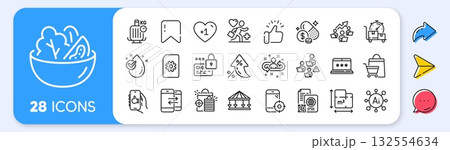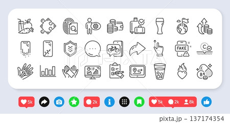 Baggage calendar, Petrol station and Food app line icons. App 3d buttons. Social media comment, share, like icons. Pack of Shield, Mail, Smartphone repair icon. Vector