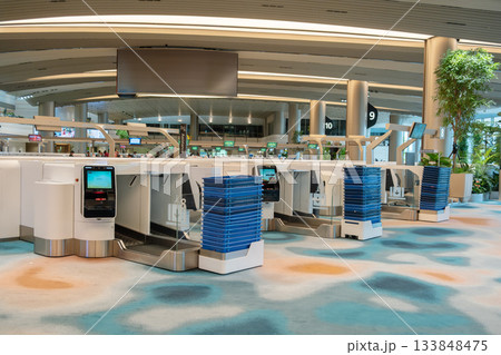 Automated self-service baggage drop counters at Changi Airport in Singapore featuring sleek design, digital screens, and blue security trays. Bright lighting and contemporary architecture