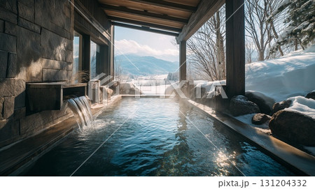 冬の露天風呂でリラックスする女性のイメージ テキストスペース 広告 背景素材 AI生成素材